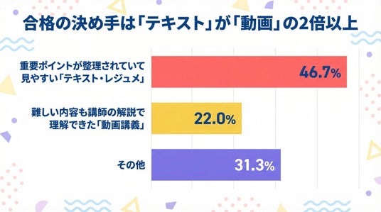 特に、合格の決め手として動画講義よりも「テキスト・レジュメ」を挙げる声が2倍以上多かった点は注目に値します。