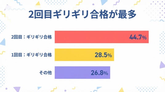 合格までの道のりを見ると、「2回目:ギリギリ合格」が44.7%と最も多く、「1回目:ギリギリ合格」が28.5%と続きます。