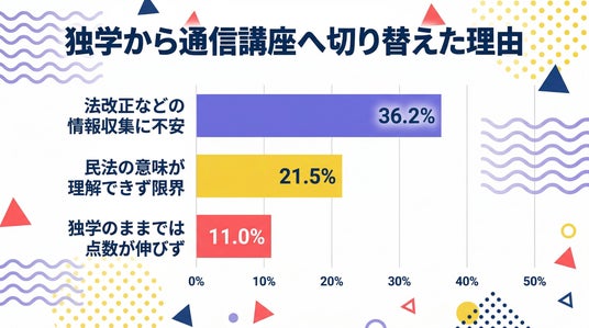 独学から通信講座へ切り替えた理由としては、「法改正などの情報収集に不安を感じたため」が36.2%で最多でした。