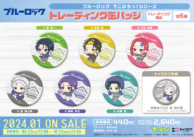 「キャラログ」にて、「ブルーロック トレーディング缶バッジ[でこぱちっ!]」を1BOXご予約度に、「特典缶バッジ 凪 誠士郎」をおひとつプレゼント!