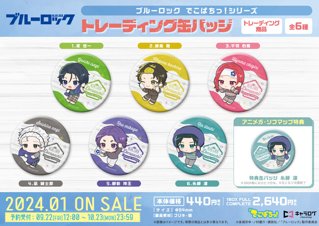 「アニメガ・ソフマップ」にて、「ブルーロック トレーディング缶バッジ[でこぱちっ!]」を1BOXご予約度に、「特典缶バッジ 糸師 凛」をおひとつプレゼント!