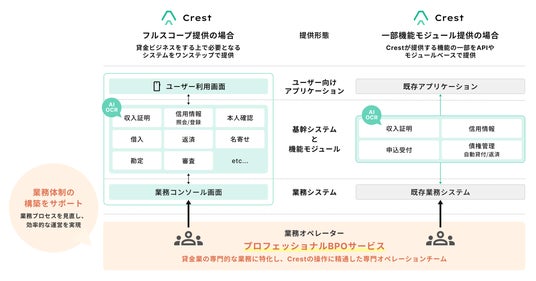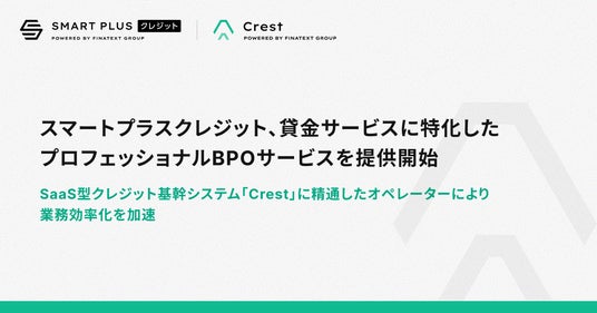 本サービスは、新たに貸金サービスに参入する、あるいは既存の貸金サービスのコストを最適化したい金融機関や事業会社が、その貸金業務全般を、株式会社Finatext(本社:東京都千代田区、代表取締役CEO:木下 あかね、以下「Finatext」)が提供するSaaS型クレジット基幹システム「Crest」に精通したスマートプラスクレジットのオペレーターにアウトソーシングできるものです。また、新規参入する事業者向けに業務体制の構築もサポートします。