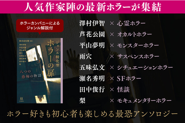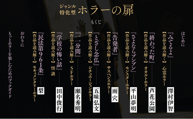 それぞれのジャンルごとに日本を代表するホラー作家、お化け屋敷プロデューサー、気鋭のホラー作家や怪談師らが短篇を書き下ろしました。