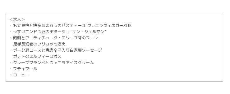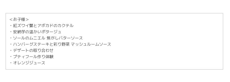 【 料 金 】 お子様(3歳~中学生)6,000円、大人9,000円(税金・サービス料を含む)