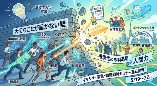 企業のブランディングを手掛ける株式会社イマジナ(本社:東京都千代田区)は、2026年5月19日から22日にポートメッセなごやで開催される「DXPO名古屋’26」に出展いたします。本展示会では、主観に頼った組織運営を脱し、データと心理学に基づいた「組織変革の4つの柱」を提案。指示待ち社員や営業力不足といった課題を根本から解決し、全社員が同じ方向を向いて躍動するためのソリューションを公開します。
