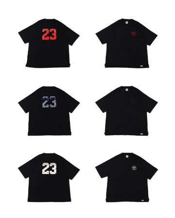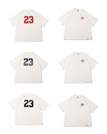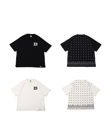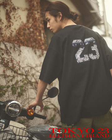ベーシックなBLACKとWHITEのボディの前身頃にチェーン刺繍で23のナンバリングを胸元に配置し、後ろ身頃にはELEPHANT BRANDオリジナルバンダナ柄を全面プリントした「TOKYO 23 × ELEPHANT BRAND BACK BANDANA PRINT TEE」と、今回の為に作製したTOKYO 23のアイコンロゴをアレンジしたコラボレーションロゴを胸元に刺繍で配置し、後ろ身頃にはELEPHANT BRANDオリジナルバンダナで作製した23ナンバリングパッチを配置した「TOKYO 23 × ELEPHANT BRAND BANDANA APPLIQUE TEE」。