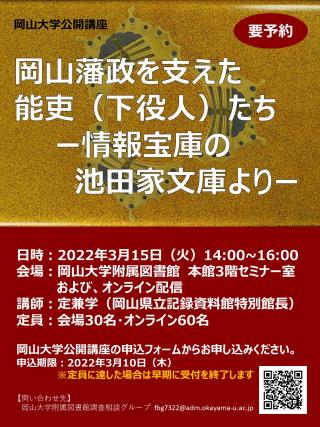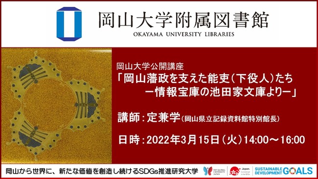 国立大学法人岡山大学(本部:岡山市北区、学長:槇野博史)の附属図書館では、公開講座「岡山藩政を支えた能吏(下役人)たちー情報宝庫の池田家文庫よりー」を、2022年3月15日(火)に会場とオンライン同時配信のハイブリット方式で実施予定です。