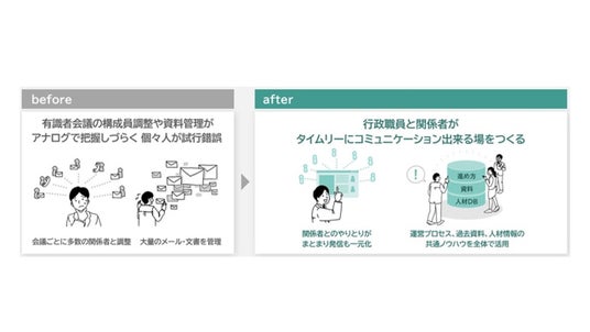 行政機関では、政策検討の際に有識者会議を活用するのが通例であり、数多くの有識者会議を開催しています。従来、有識者とのスケジュール調整や書類のやり取りは全て個別にメールや文書で対応する必要があり、それによって担当者が忙殺される事態も少なくありません。そのため、本来注力するべき政策立案等の業務に十分な時間を割くことができないという課題が行政機関で生じています。