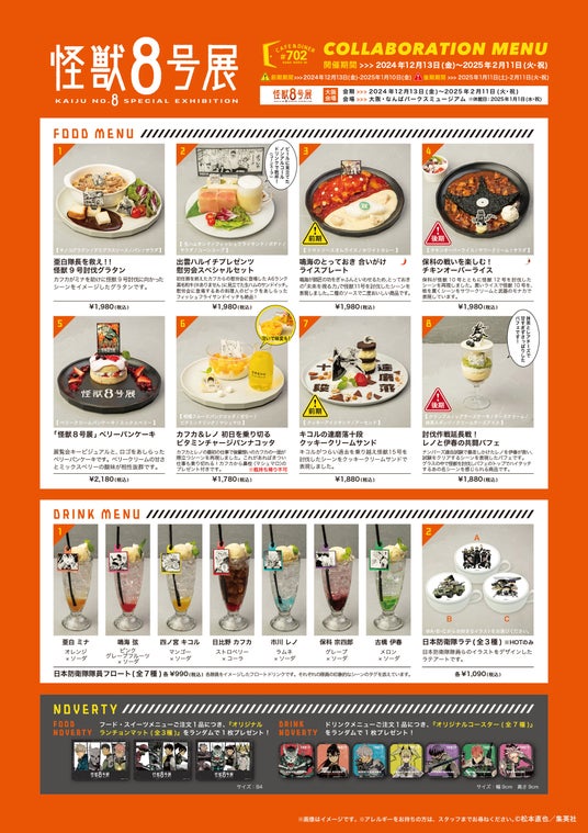 【「怪獣8号展」コラボレーションカフェ】は、複合型商業施設・なんばパークス内『なんばパークスミュージアム』で開催されるイベント「怪獣8号展」と連動したコラボカフェ企画となっております。店内のコラボレーションスペースは【「怪獣8号展」コラボレーションカフェ】仕様に装飾され、この企画のために開発されたメニューは、ストーリーの名シーンを切り取ったラインアップ。カフカがミナを助けに怪獣9号討伐に向かったシーンをイメージした「亜白隊長を救え!!怪獣9号討伐グラタン」や鳴海が師匠の功をぎゃふんといわせるためのとっておきの「未来を視る力」で怪獣11号を討伐したシーンをイメージした「鳴海のとっておき 合いがけライスプレート」などファンであれば思わず唸るフード・スイーツ・ドリンクのオリジナルメニューを揃えました。