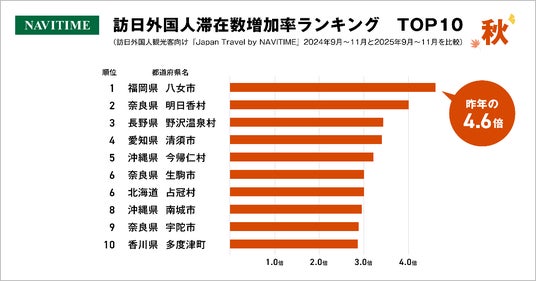 株式会社ナビタイムジャパン(代表取締役社長:大西 啓介、本社:東京都港区)のNAVITIMEデータ分析チームは、訪日外国人観光客向けのナビゲーションアプリ『Japan Travel by NAVITIME』の利用状況から、2025年の秋に訪日外国人旅行者の滞在が増加している地域の分析結果を発表いたします。
