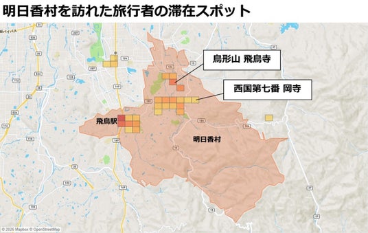 明日香村での滞在エリアを確認すると、飛鳥寺、紅葉の名所としても知られる岡寺での滞在が確認されました。