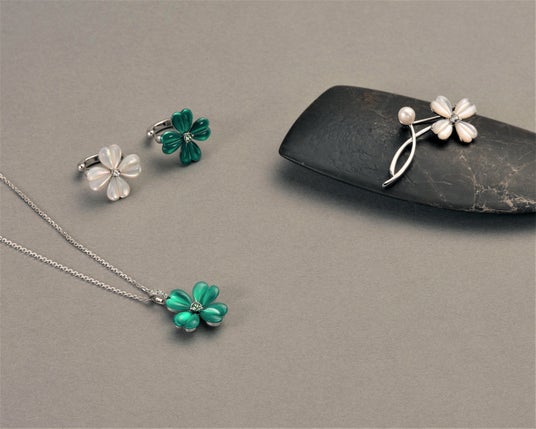 クローバーモチーフは、上品な輝きの白蝶貝に加え、新たに鮮やかなグリーンカルセドニーを贅沢に使用したアイテムが登場。透明感のある美しいグリーンが、爽やかで瑞々しい表情を添えます。身に着けるとクローバーのフォルムが際立ち、スタイリングに華やかさをプラスします。