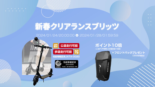 楽天市場「Show !t」は今話題の特定小型区分電動キックボード購入で3,000円相当のちょっとしたお出かけに便利なフロントバックがプレゼントとなるキャンペーンを開催します。また、1月24日(水)20:00~1月28日(日)01:59まで開催される、楽天お買い物マラソンに参加し、ポイント10倍プレゼントを実施します。この機会にMEISTER.Fの特定小型区電動キックボードを手に入れて、快適な近距離移動を体験しましょう。