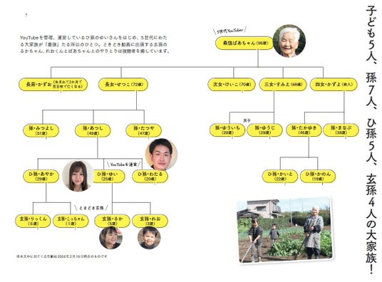 ばあちゃんが93歳のときに始めたYouTubeの動画が知らず知らずのうちに大人気。いくつになっても元気に畑仕事や料理をこなす、ばあちゃんの日常と、ときどき顔を出す玄孫たちとのやりとりが好評を得る。登録者数は10.3万人(2024年2月現在)。