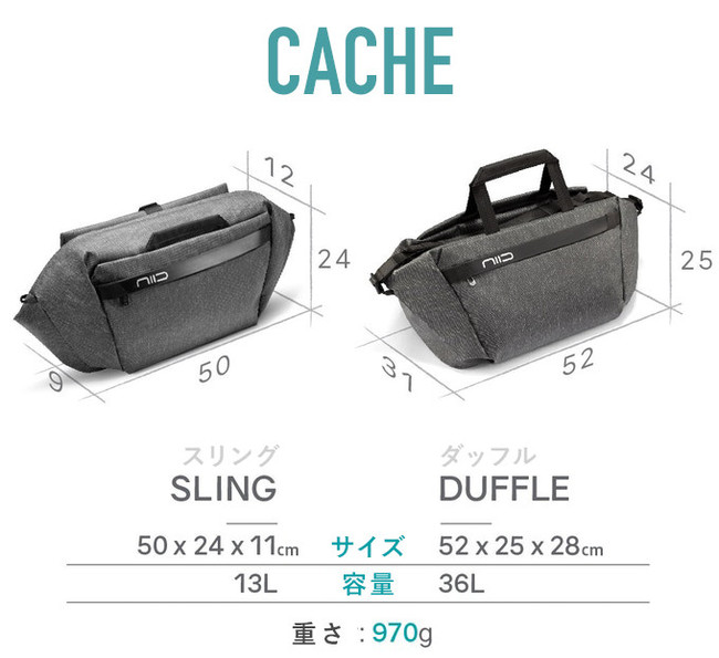 【CACHE】(キャッシュ)は、優れた機能性とデザイン性で知られるバッグメーカー「NIID」発の「スリングバッグ&ダッフルバッグ兼用2wayバッグ」です。拡張時の最大容量は36Lで、傘や水筒などの小物類から15インチ以下のPCまでばっちり収納できます。 防水仕様のため、雨天時や水辺での活動にも安心です。さらに豊富なオプションアクセサリーを取り揃えており、お好みの形にカスタマイズを楽しめます。