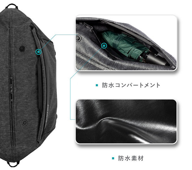 防水コンパートメントには濡れた折り畳み傘を入れたり、水滴が気になる水筒やペットボトルなどの収納にも最適です。