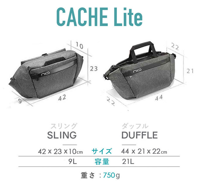 また今回は、9L~21Lのミニサイズ【CACHE Lite(キャッチライト)】も同時に展開。よりコンパクトにすっきりと持ち運ぶことができ、ダッフルモードではPCコンパートメントも利用できます。