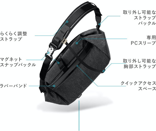毎日に寄り添うことを目的として開発された【CACHE】は、機能性に優れ使い勝手が抜群。スマホ用ポーチ、小物用コンパートメント、スリングストラップを標準装備しており、オプションのPCコンパートメントは15インチのパソコンまで対応できます。