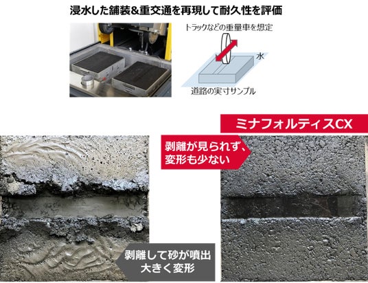 当社はこれまで、施工性に着目したアスファルト「グランファルトART(エーアールティー)」や、リサイクルに着目した「リプロシリーズ(再生用アスファルト:リプロファルト300、再生用添加剤:リプロバイタル200・リプロバイタル500)」など、世の中のニーズに応える高性能な舗装材を展開してきました。このたび発売する「ミナフォルティスCX」の製品名には、共有結合(Covalent Bond)の効果によって水による損傷を防ぎ、舗装が強靭になる体験(eXperience)をお客様に提供し、生活に不可欠な人やモノの移動を支えるという意味が込められています。当社は今後も技術力を生かし、社会の課題解決につながる製品開発を進めます。