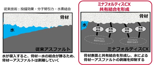 今回、当社はアスファルトに骨材の表面と化学的に強固な共有結合を形成する性質を付与する独自の新技術を開発しました。この技術により耐水性が向上し、舗装の強度が上がることで損傷を防ぎます。