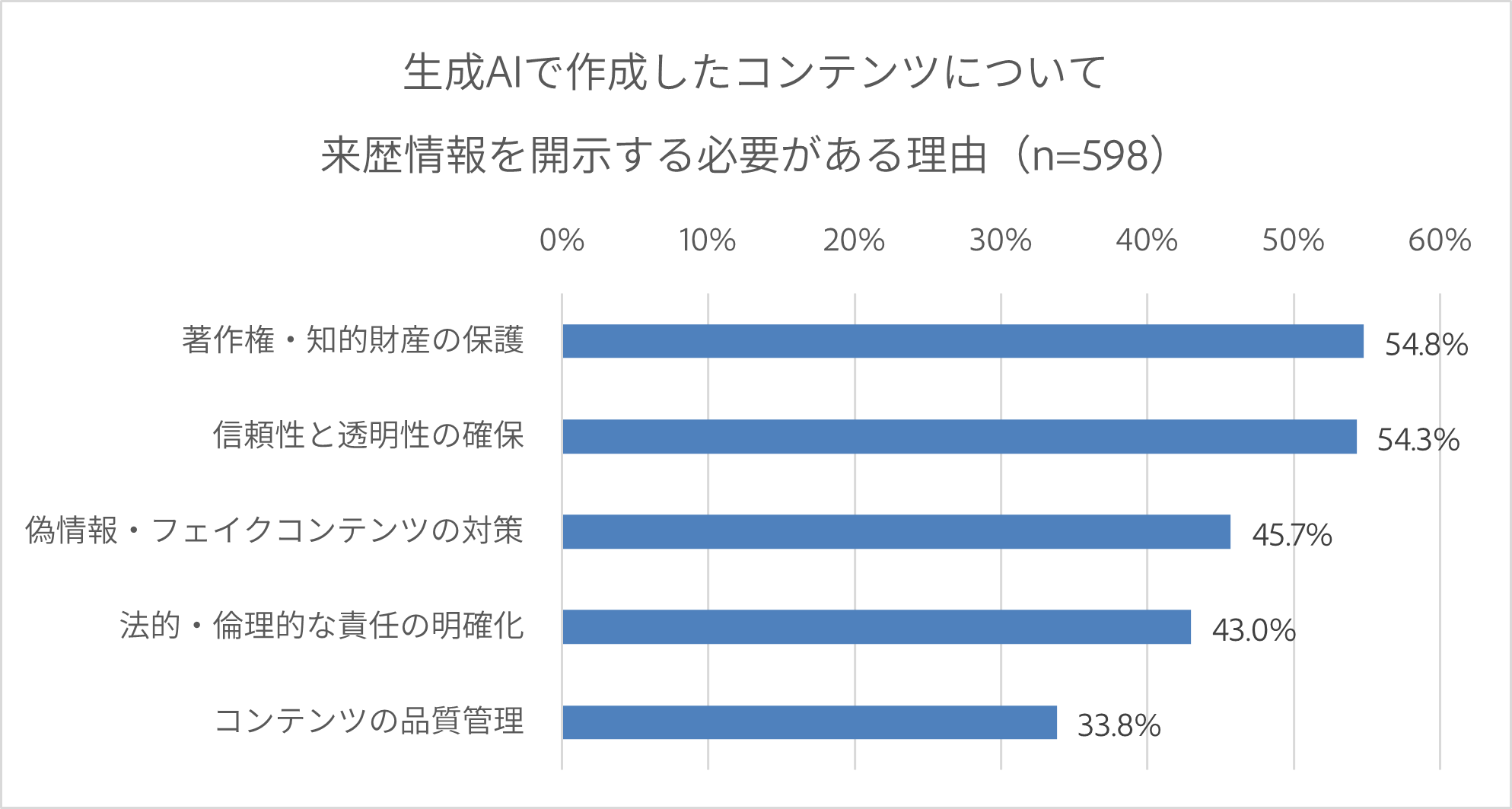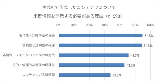 生成AIで作成したコンテンツについて、作成経緯や利用したAIツールなどの来歴情報の開示が必要と回答した人は約6割に上りました。主な理由として「信頼性と透明性の確保(54.3%)」、「著作権・知的財産保護(54.8%)」、「偽情報・フェイクコンテンツ対策(45.7%)」が挙げられ、ビジネスパーソンの間で生成AIを活用する上で信頼性と透明性を重視する意識の高まりがうかがえます。