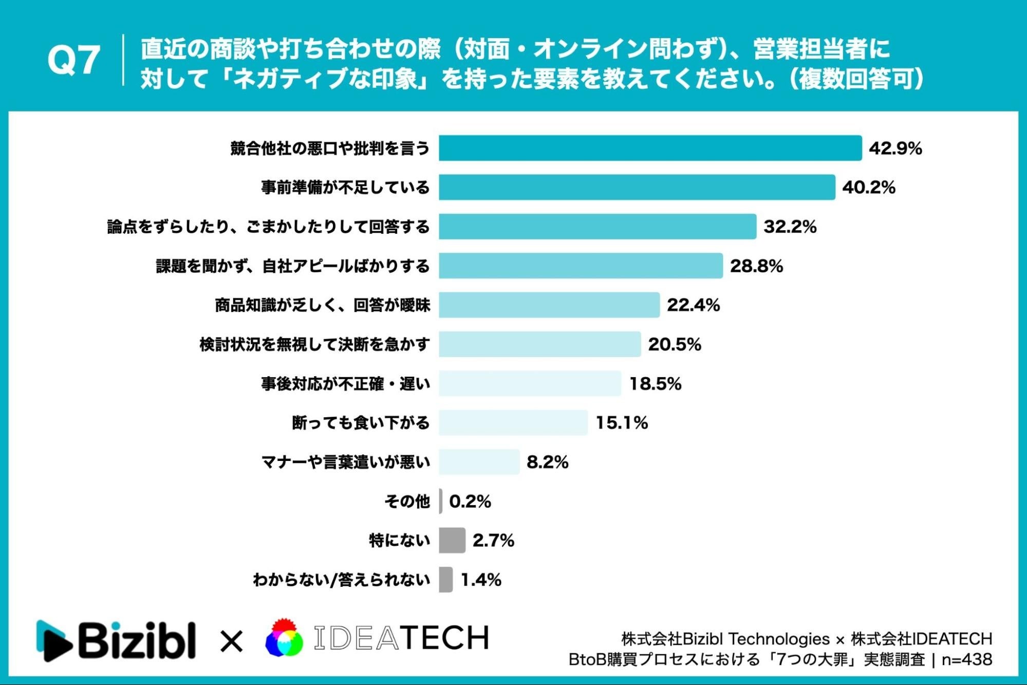 「Q7. 直近の商談や打ち合わせの際(対面・オンライン問わず)、営業担当者に対して「ネガティブな印象」を持った要素を教えてください。(複数回答可)」(n=438)と質問したところ、「競合他社の悪口や批判を言う」が42.9%、「事前準備が不足している」が40.2%、「論点をずらしたり、ごまかしたりして回答する」が32.2%という回答となりました。