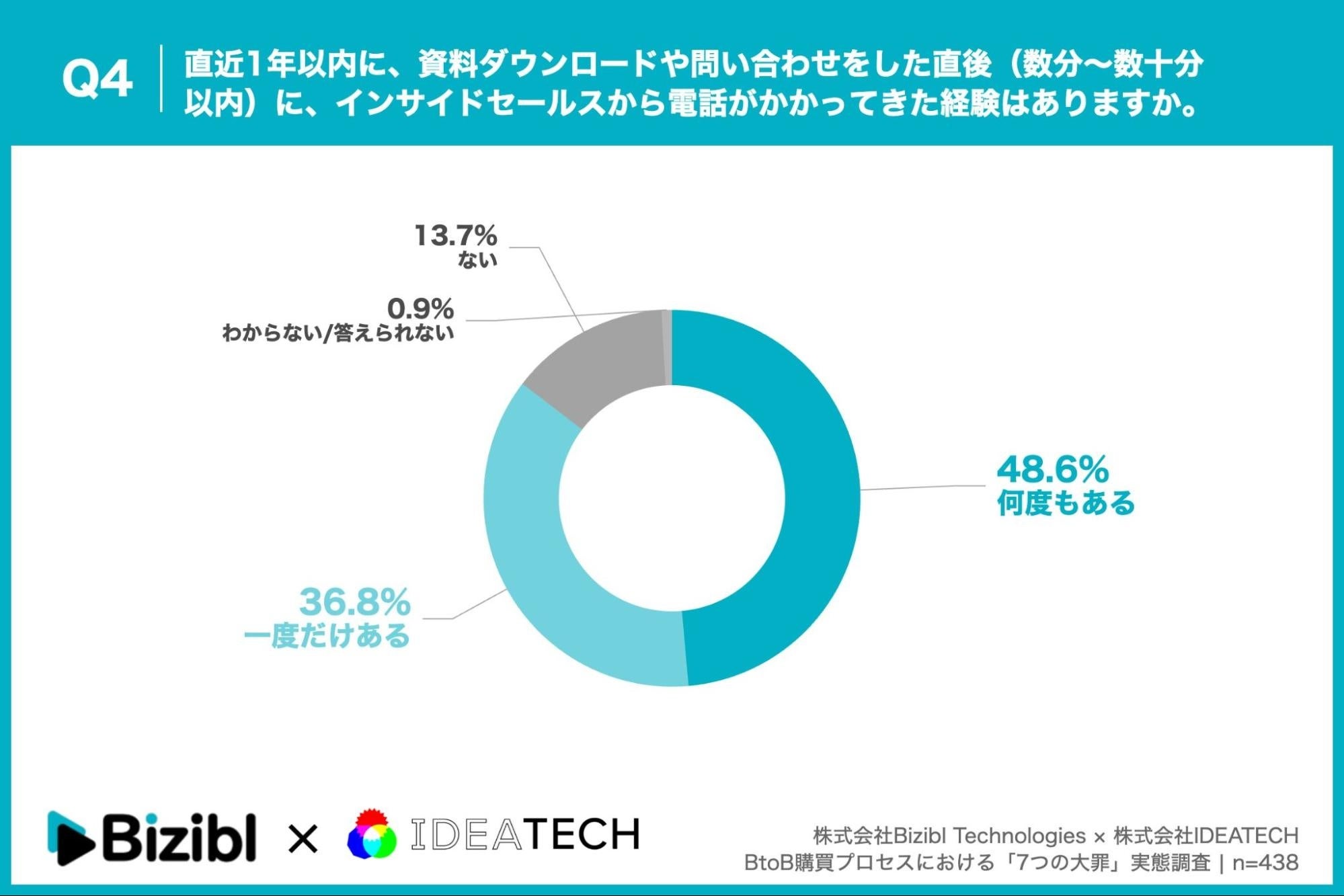 「Q4. 直近1年以内に、資料ダウンロードや問い合わせをした直後(数分~数十分以内)に、インサイドセールスから電話がかかってきた経験はありますか。」(n=438)と質問したところ、「何度もある」が48.6%、「一度だけある」が36.8%という回答となりました。