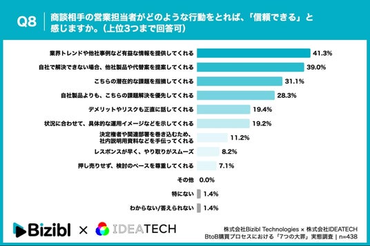 「Q8. 商談相手の営業担当者がどのような行動をとれば、「信頼できる」と感じますか。(上位3つまで回答可)」(n=438)と質問したところ、「業界トレンドや他社事例など有益な情報を提供してくれる」が41.3%、「自社で解決できない場合、他社製品や代替案を提案してくれる」が39.0%、「こちらの潜在的な課題を指摘してくれる」が31.1%という回答となりました。