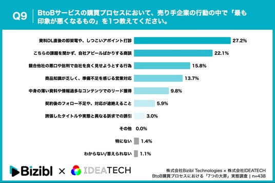 「Q9. BtoBサービスの購買プロセスにおいて、売り手企業の行動の中で「最も印象が悪くなるもの」を1つ教えてください。」(n=438)と質問したところ、「中身の薄い資料や情報過多なコンテンツでのリード獲得」が9.8%、「資料DL直後の即架電や、しつこいアポイント打診」が27.2%という回答となりました。