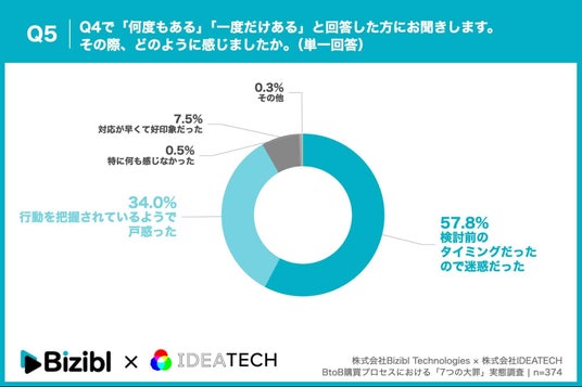 「Q5. Q4で「何度もある」「一度だけある」と回答した方にお聞きします。その際、どのように感じましたか。(単一回答)」(n=374)と質問したところ、「行動を把握されているようで戸惑った」が34.0%、「検討前のタイミングだったので迷惑だった」が57.8%という回答となりました。