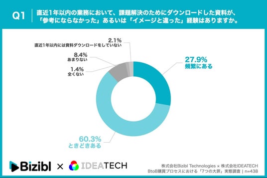 「Q1. 直近1年以内の業務において、課題解決のためにダウンロードした資料(ホワイトペーパー等)が、「参考にならなかった」あるいは「イメージと違った」経験はありますか。」(n=438)と質問したところ、「頻繁にある」が27.9%、「ときどきある」が60.3%という回答となりました。