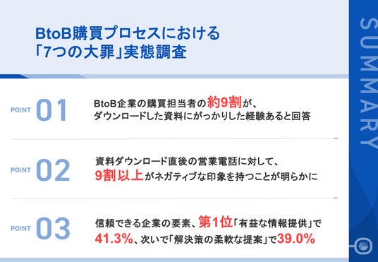今回は、BtoB企業の購買担当者438名を対象に、BtoB購買プロセスにおける「7つの大罪」実態調査を実施しました。その結果、直近1年以内にダウンロードした資料が「参考にならなかった」「イメージと違った」経験がある人が88.2%に上り、契約・導入後のフォロー不足を感じた経験がある人も79.0%に達することが明らかになりました。