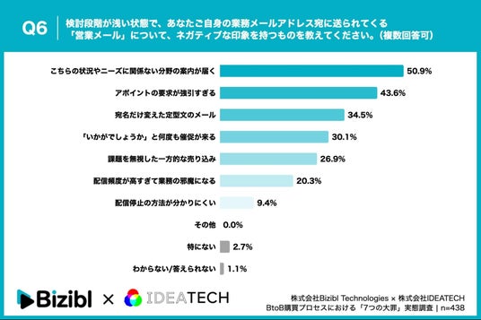 「Q6. 検討段階が浅い状態で、あなたご自身の業務メールアドレス宛に送られてくる「営業メール」について、ネガティブな印象を持つものを教えてください。(複数回答可)」(n=438)と質問したところ、「こちらの状況やニーズに関係ない分野の案内が届く」が50.9%、「アポイントの要求が強引すぎる」が43.6%、「宛名だけ変えた定型文のメール」が34.5%という回答となりました。
