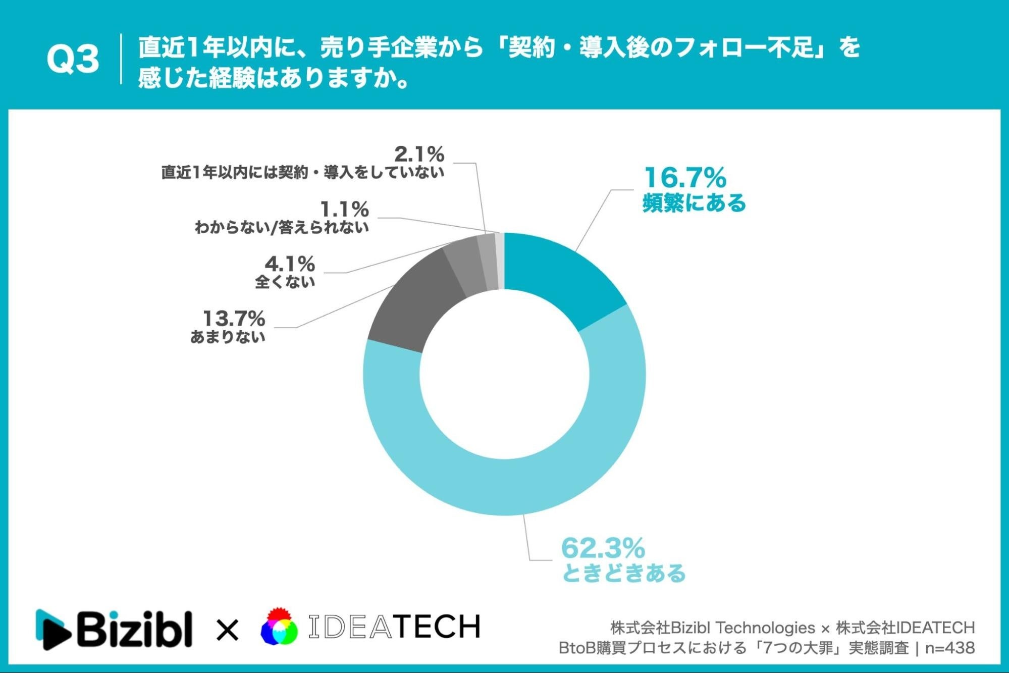 「Q3. 直近1年以内に、売り手企業から「契約・導入後のフォロー不足」を感じた経験はありますか。」(n=438)と質問したところ、「頻繁にある」が16.7%、「ときどきある」が62.3%という回答となりました。