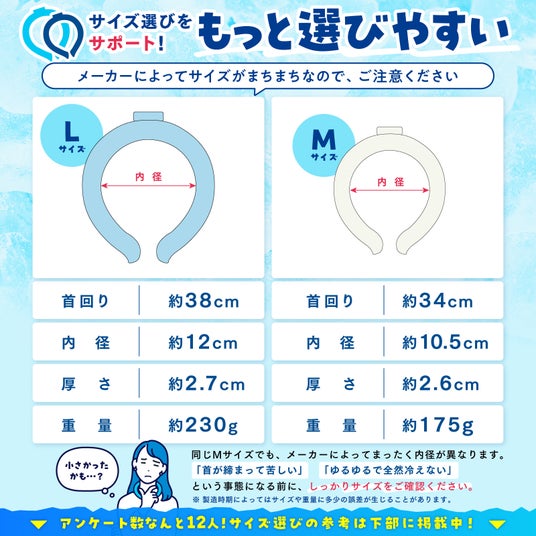 首元ひんやり君(クールネックリング)の中で、最も人気があるのはLサイズです。Lサイズは男性にも使いやすい大きめサイズで、広い首回りをしっかり冷却できるため、特に男性のお客様から多くの支持をいただいています。サイズ選びの際も、Lサイズを選ばれる方が圧倒的に多く、暑さ対策として最適なサイズとなっています。