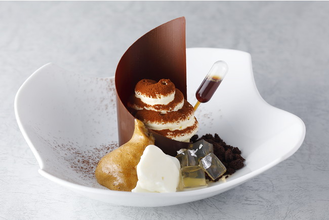 世界的に有名なイタリアのデザート「ティラミス」。シェフの独自な発想で再構成したひと皿です。マスカルポーネのクリームにアーモンドのビスキュイを重ねました。カフェの風味を引き立てるドゥルセデレーチェで作ったクレームブリュレがアクセントです。