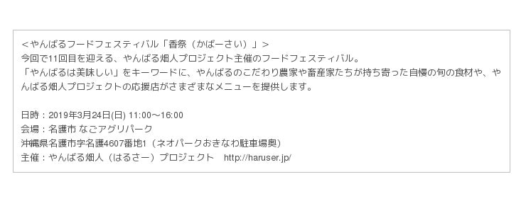 グローバルブランドリゾート・オキナワ マリオット リゾート & スパ(沖縄県名護市喜瀬1490-1 総支配人:齊川慶一 )は、2019年3月24日(日)に開催される、やんばるフードフェスティバル「香祭(かばーさい)」に出店いたします。和食、洋食、中華、ペストリーのシェフ達が香祭のためにアレンジした、オリジナルメニューをご提供いたします。