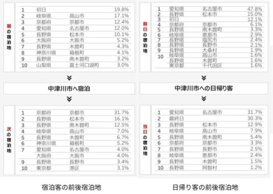 一方、中津川市を日帰りした観光客の前後の宿泊地は、前泊地・当日の宿泊地ともに名古屋市が1位になっています。