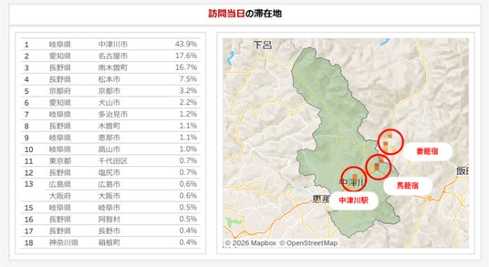中津川市と中津川市に隣接する南木曽町内の滞在箇所を見ると、宿泊客・日帰り客ともに中津川駅や馬籠宿、妻籠宿に滞在していることが分かります。