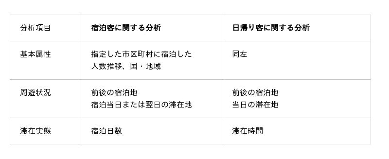 昨今、訪日外国人観光客による地域経済への波及効果を高めるため、来訪者数だけでなく、「実際に地域内に泊まっているのか」「流出先を特定したい」「日帰り客と宿泊客で行動にどのような違いがあるのか知りたい」といった、地域への実質的な影響を示す実態把握に関する課題やご要望を多くいただいておりました。