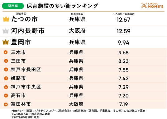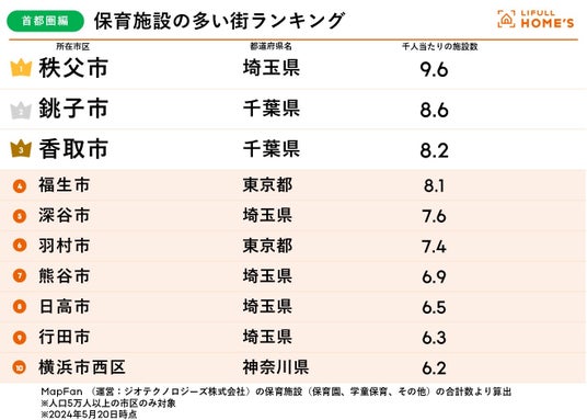 働きながら子育てをする共働き家庭にとって、保育施設が自宅の近くにあることは欠かせません。保育園や学童保育など保育施設の合計数から9歳以下の子ども人口千人あたりの保育施設数を算出した「保育施設の多い街」で、首都圏1位は「埼玉県秩父市」、関西1位は「兵庫県たつの市」でした。