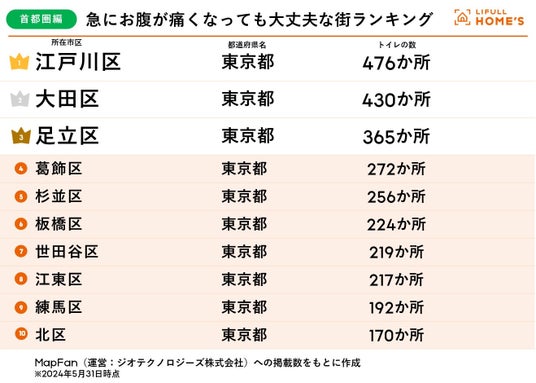 4.「急にお腹が痛くなっても大丈夫な街」は「東京都江戸川区」「兵庫県尼崎市」が1位に。上位の街には公園や公共施設が充実