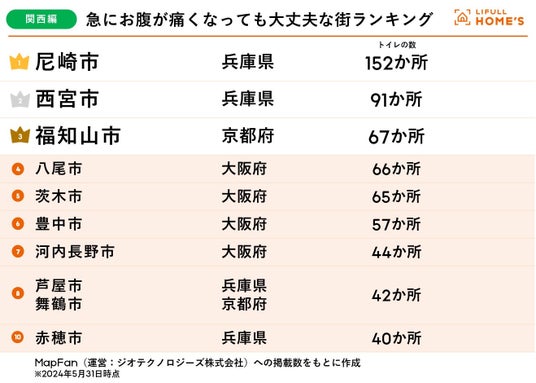 子どもと出かけていると急に「トイレに行きたい」とせがまれることも多い子育て世代には、近場のトイレの数も気になるところ。各自治体の公衆トイレの数を調べた結果、首都圏では「東京都江戸川区」、関西では「兵庫県尼崎市」が1位になりました。公衆トイレの数は公園や公共施設の数と連動しており、上位の街は公園や公共施設が多い街ともいえます。