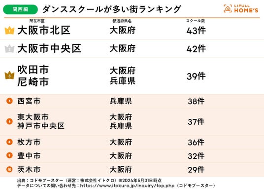あらゆる世界大会で日本人が優秀な成績をおさめているブレイクダンス(ブレイキン)をはじめ、話題に挙がることの多いダンス。2012年から中学校の保健体育で必修とされ、柔軟性やリズム感を育めるスポーツとして子どもの頃から習い事に選ぶ家庭も増えています。ゆくゆくはプロのダンサーになりたいと夢が持てそうな「ダンススクールが多い街」を調べたところ、首都圏では「東京都世田谷区」、関西では「大阪市北区」が1位となりました。