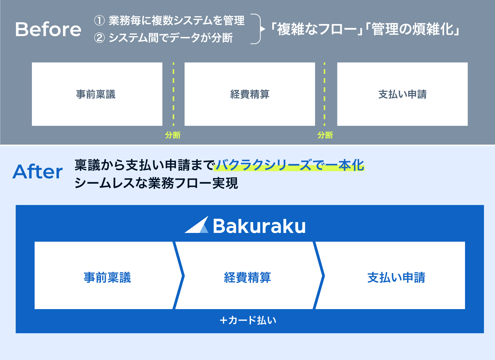 従来の運用では、事前稟議・経費精算・会計など業務ごとに複数システムを利用しており、申請データと経費・支払データが分断されていることによる業務負荷や管理の煩雑化が課題となっていました。