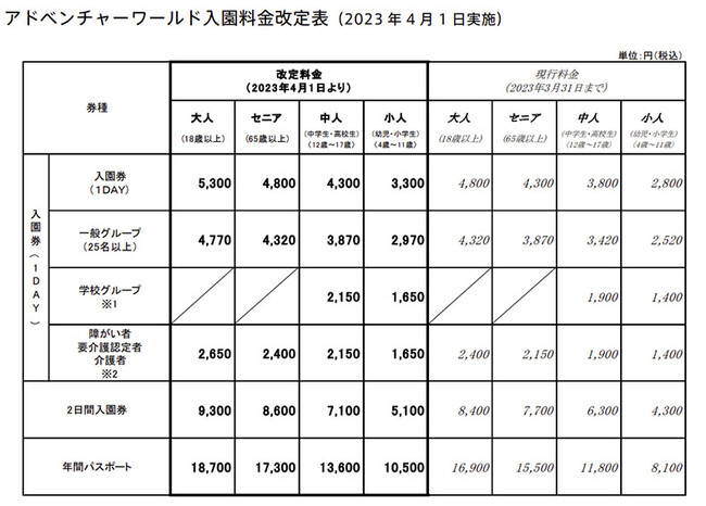 アドベンチャーワールド(和歌山県⽩浜町)は、2023年4月1日(土)より、以下のとおり入園料金の改定を行いますので、お知らせいたします。