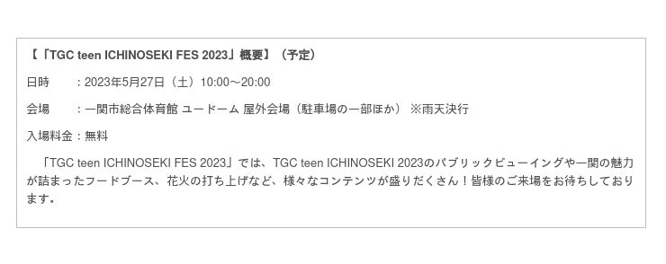 ■一関市総合体育館 ユードーム 屋外会場にて「TGC teen ICHINOSEKI FES 2023」同日開催決定!