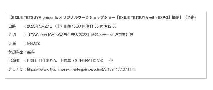 そしてこの度、TGC teen ICHINOSEKI 2023と連動して、一関市総合体育館 ユードーム 屋外会場(駐車場の一部ほか)で同日開催を予定している「TGC teen ICHINOSEKI FES 2023」の特設ステージにて、EXILE TETSUYA presents オリジナルワークショップショー「EXILE TETSUYA with EXPG」の開催が決定!参加無料での開催を予定している本ワークショップには、EXILE TETSUYA、そしてGENERATIONSの小森隼の出演が決定!ご来場いただくあらゆる世代の方々と一体となり、LDH所属アーティストの数々の名曲に合わせてダンスを楽しみ、身体を動かしながら、SDGs目標「3.すべての人に健康と福祉を」を推進します。