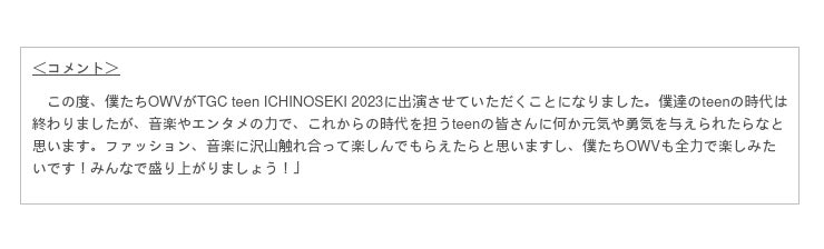 TGC teen ICHINOSEKI 2023大注目のアーティストに、2019年に社会現象を起こした日本最大級のオーディション番組「PRODUCE 101 JAPAN」に出演した元練習生4名により結成されたボーイズグループOWVが追加決定!TGC teen初登場となるOWVからコメントが届きました!