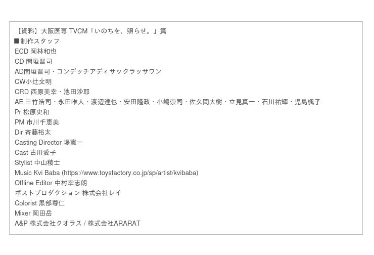 このTVCMのテーマ「いのちを、照らせ。」に合わせ、医療・福祉・スポーツの道を志す人へ向けて、23歳のラッパー/シンガーソングライターKvi Babaさんが心を揺さぶるメロディックなフロウで楽曲を書き下ろしてくれました。是非ご視聴ください!